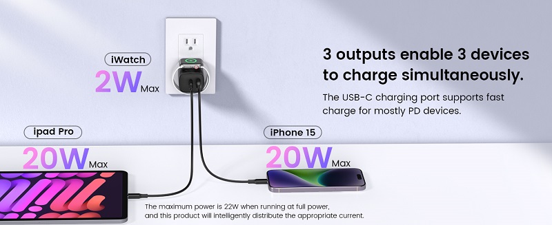 - 【All-in-One Charger for Apple Watch 】 This compact wall charger integrates a dedicated magnetic charging spot for your Apple Watch, plus a 20W USB-C port and an 18W USB-A port. The built-in, secure magnetic alignment makes charging your watch effortless—just snap it on. No extra cables or clutter needed for your watch, making it an essential space-saving solution for travel, your bedside, or your desk.(*Note: When charging three devices simultaneously, the device temperature may rise slightly, but this is normal operation. )