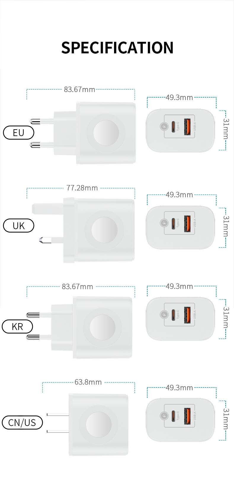 US:L63.8*W49.3*H31mm EU:L83.67*W49.2*H31mm UK:L77.28*W49.2*H31mm |