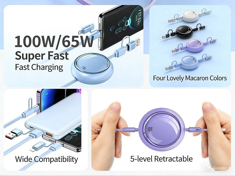 Retractable 100W Multi 4-in-1 Travel Universal Charger Cable USB A/Type C to Lightning+USB C iPhone Charging Cable,Fast Multiple Charger Cord Combo for iPhone 15 14 13 12/Samsung/iPad Pro/Huawei-3FT