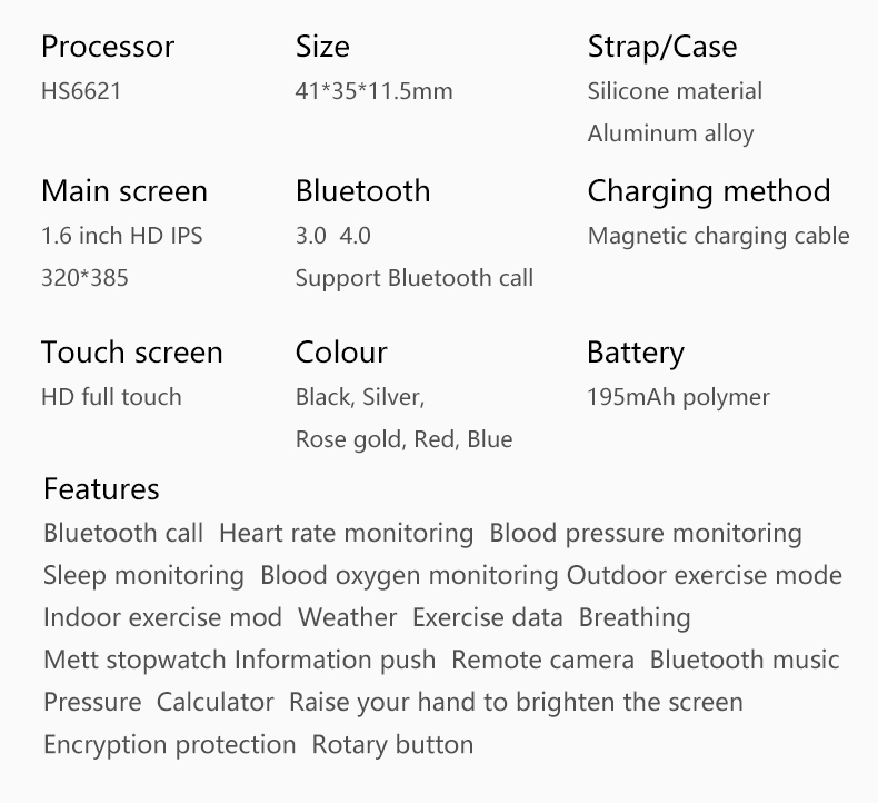 pictures, calculator, brightness level, do not disturb mode, heart rate test, dialing, pressure, setting, blood oxygen test, sleep monitoring, emergency call, indoor sports (indoor running, indoor riding, swimming in the pool, sit-ups, push-ups), sound and vibration adjustment, outdoor sports。 |